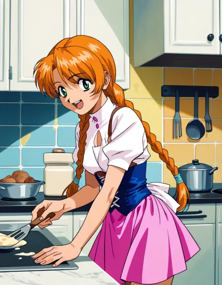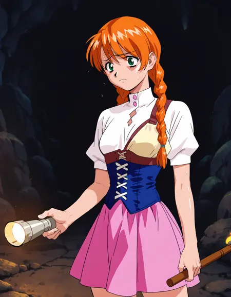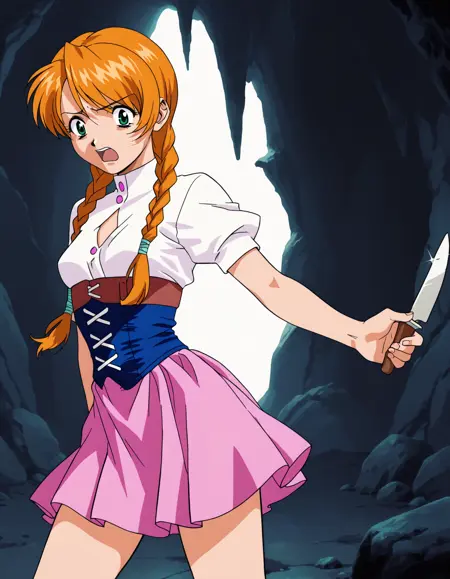 복장: 흰 셔츠, 짧은 소매, 파란 코르셋, 분홍 스커트