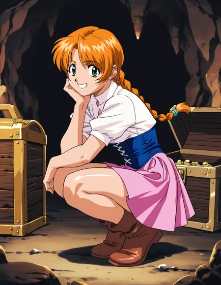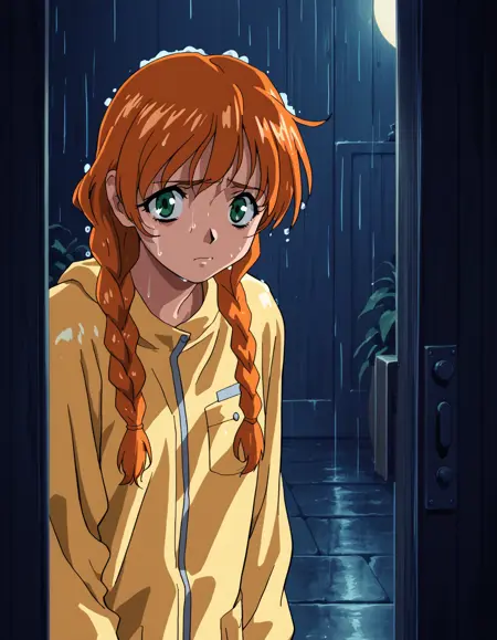 트리거: jota, 녹색 눈, 주황색 머리카락, 쌍둥이 땋은 머리