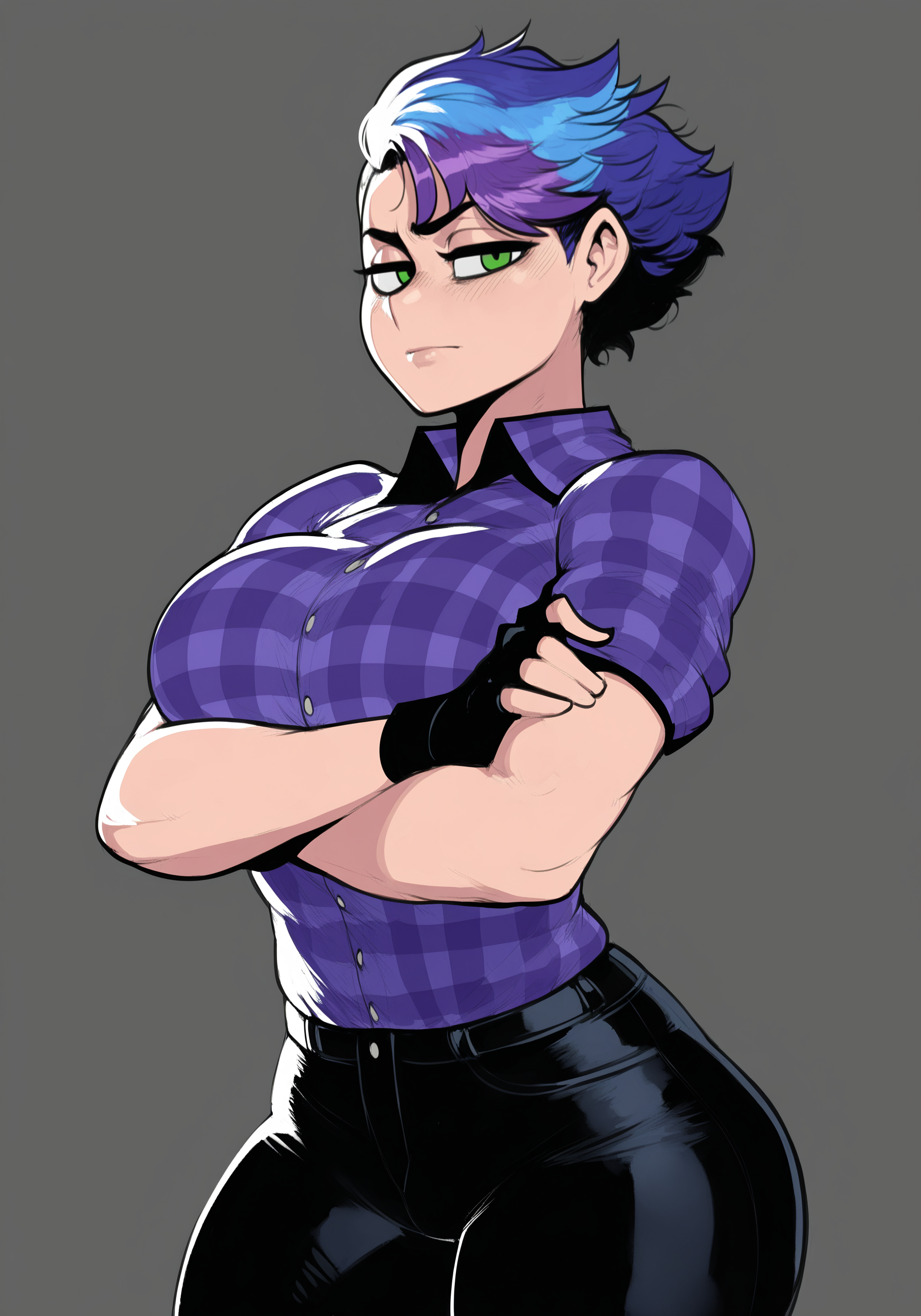 사용법: "1girl, anonymous asexual, short hair, multicolored hair, purple hair, blue hair, green eyes, (옵션) 플레드 셔츠, 버튼업 셔츠, 보라색 셔츠, 손가락 없는 장갑"