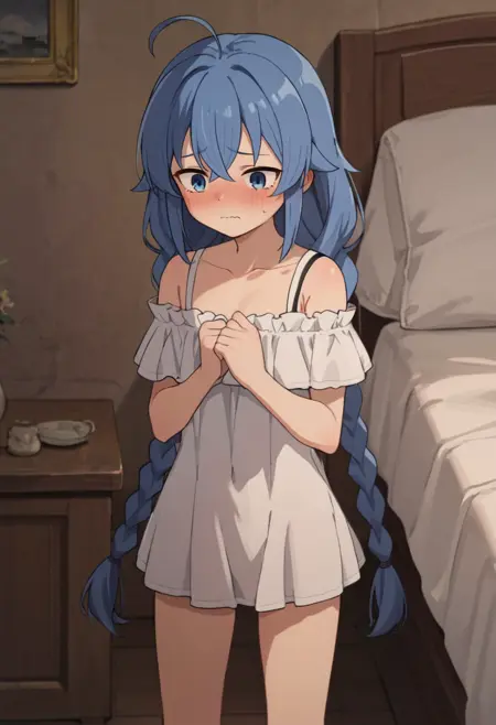 roxy-pajamas,roxy migurdia,blue eyes,blue hair,ahoge,twin braids,white dress,frills,short dress,bare shoulders,off shoulder,white spaghetti straps,black spaghetti straps