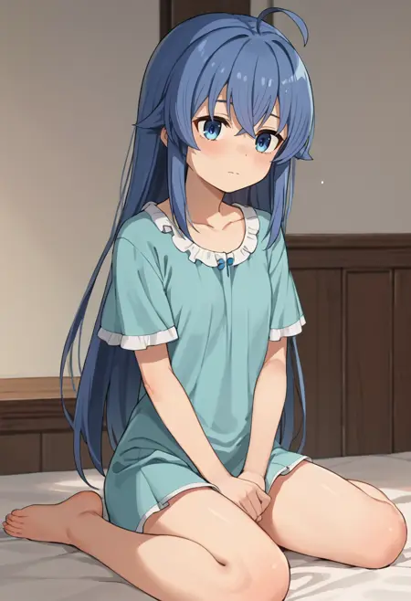 roxy-default,roxy migurdia,blue eyes,blue hair,very long hair,straight hair,hair down,ahoge,oversized shirt,(white shirt:1.2)