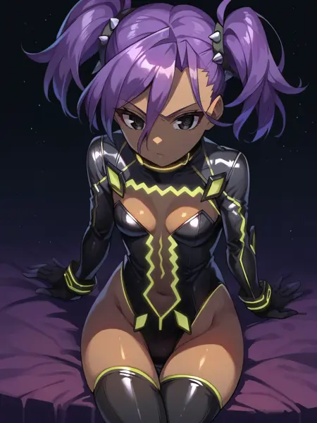 nakri, purple hair, hair between eyes, bangs, black eyes, short twintails,dark skin, hair ornament, spiked collar,