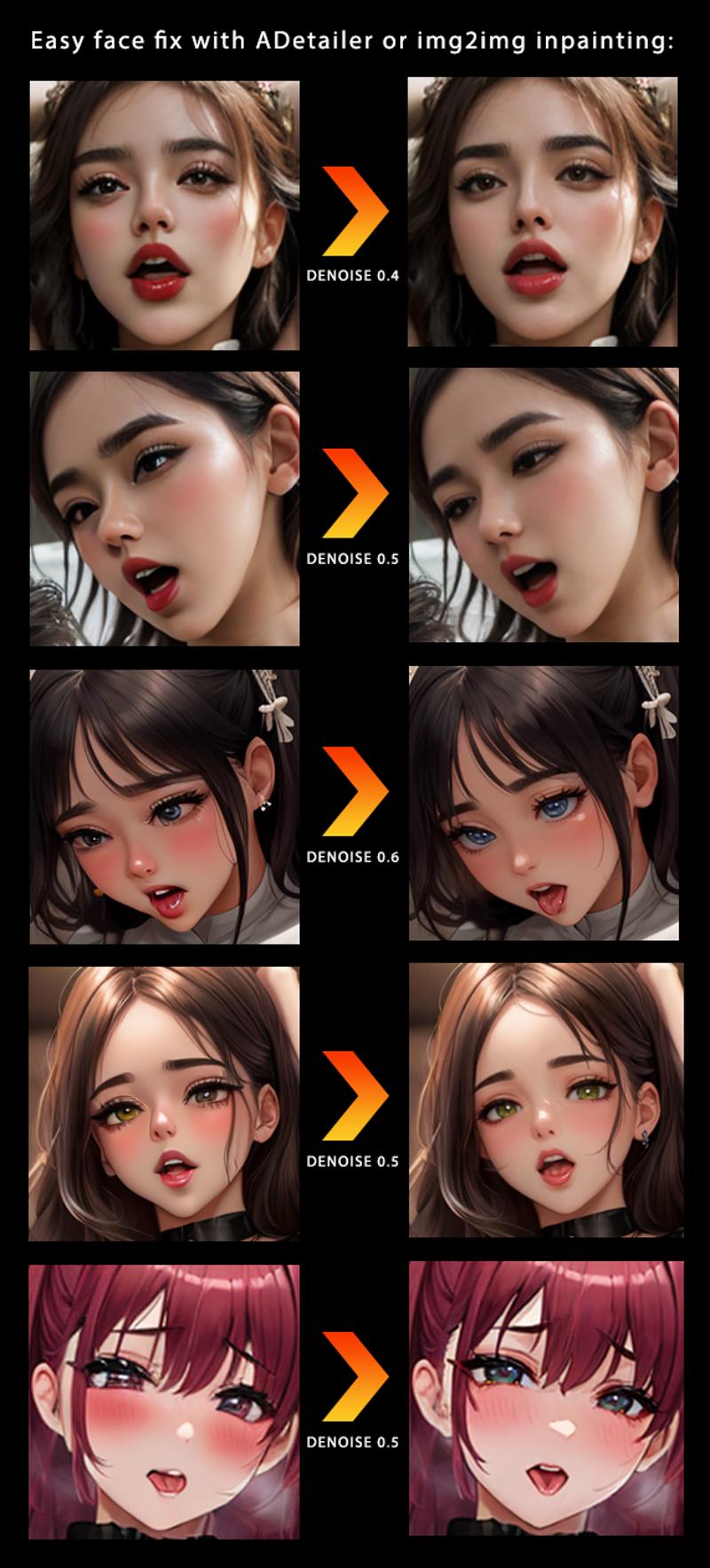 请务必使用 ADetailer 或 img2img 内补绘画处理女性面部(参见 ADetailer 部分)!