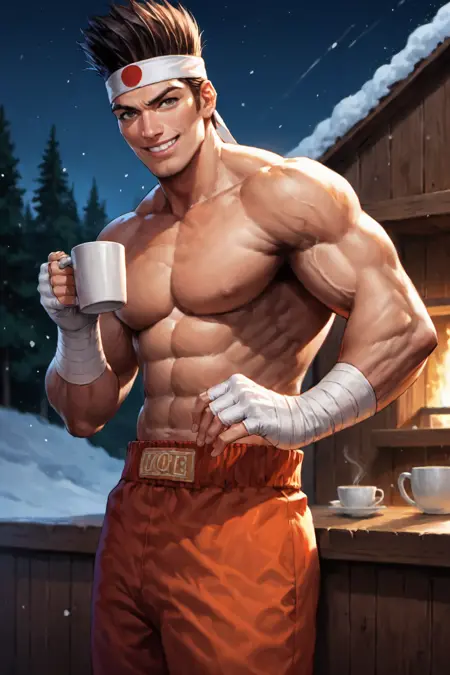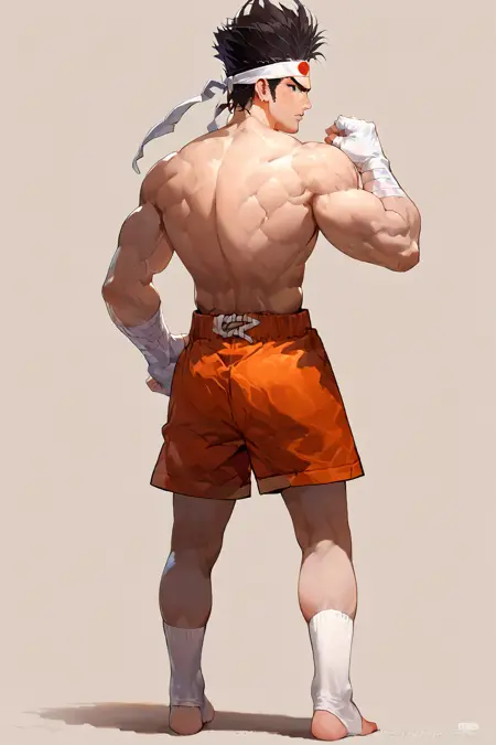 relevant tags: headband, white hand wraps, orange shorts, white foot wraps. You can also add armbands, brown muay Thai socks. Sometimes you need to specify things like Japan/white headband, black spiked hair and fingerless gloves