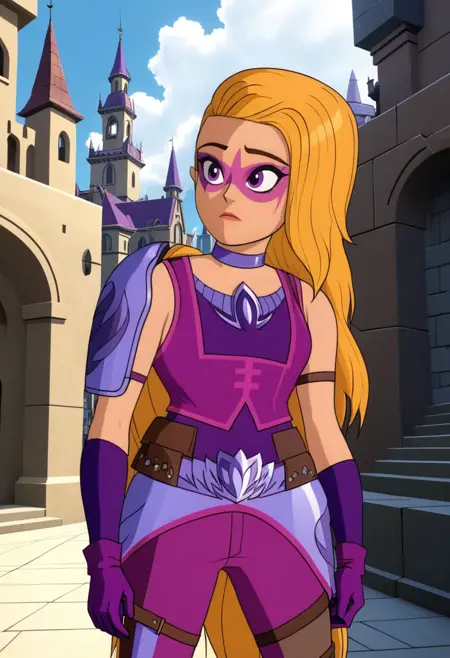 Magic: blonde long hair, tattoo around eyes, purple eyes, asymmetrical (brown leather) armored right shoulder pad, choker, purple gloves, purple sleeveless chestplate, light purple belt, purple tight pants, knee pads, brown reinforced boots