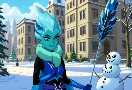 Default look: colored skin, blue skin, tattoo around the eyes, light teal fur scarf, light blue cape, dark blue and black skirt, black tight pants, black suit, blue boots, blue gloves, ice hair