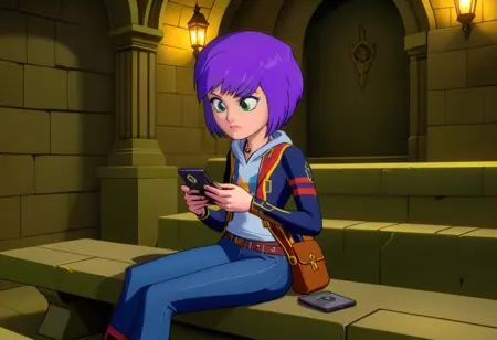 일상복: 보라색 짧은 머리, 녹색 눈, 밝은 하늘색 스웨터, 붉은 테두리가 있는 진한 파란색 오픈 재킷, 목걸이, 갈색 패니팩, 갈색 벨트, 청바지, 진한 파란색 짧은 신발