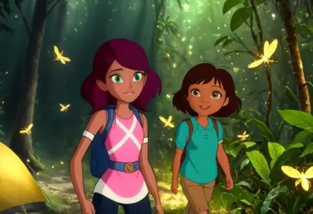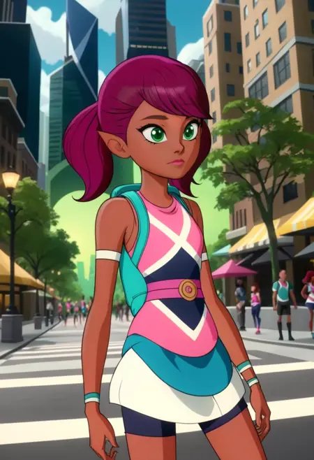 일상복: 검은 피부, 검은 피부 여성, 진한 붉은 머리, 트윈테일, 뾰족한 귀, 흰색 팔찌, 밝은 보라색 배낭, 청록색 무늬가 있는 소매 없는 분홍색 상의, 분홍색 천 벨트, 분홍색 및 흰색 짧은 치마, 검은 스포츠 바지, 흰색 및 분홍색 무늬가 있는 진한 청록색 부츠, 어깨 노출, 녹색 눈마법 복장: 검은 피부, 검은 피부 여성, 뾰족한 귀, 사파이어 파란 장갑, 소매 없는 황금노랑 및 흰색 바디수트, 황금 무늬가 있는 흰색 조임 바지, 사파이어 파란 칼라, 사파이어 파란 짧은 부츠, 어깨 노출, 눈 주변 문신, 녹색 눈, 붉은 머리, 트윈테일, 금색 팔찌, 금색 벨트