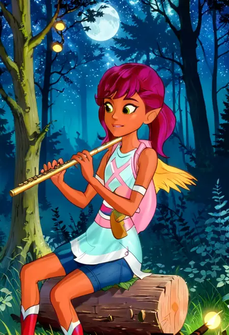 休闲装:深色皮肤,深色女性,深红发,双马尾,尖耳,白色臂环,浅紫色背包,无袖粉红上衣带青色图案,粉色布腰带,粉白短裙,黑色运动裤,带白粉图案的深青色靴子,裸露肩膀,绿色眼睛