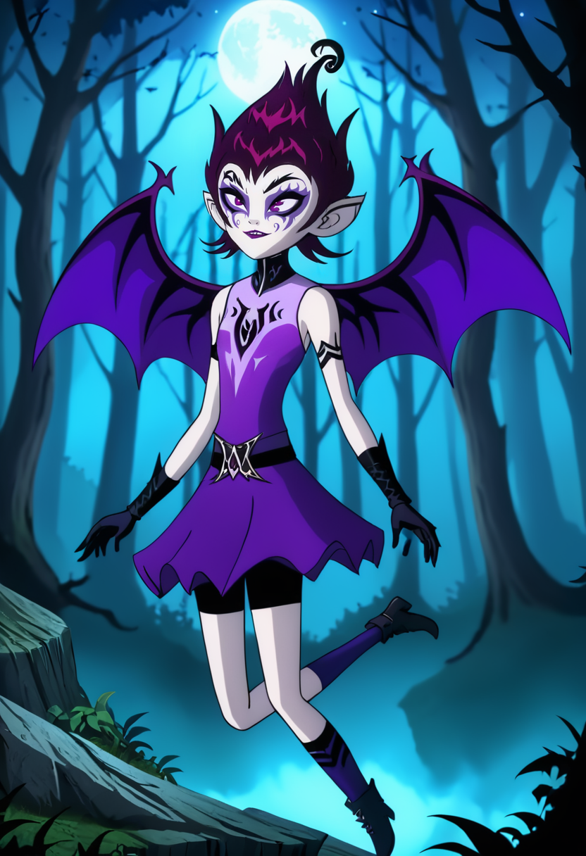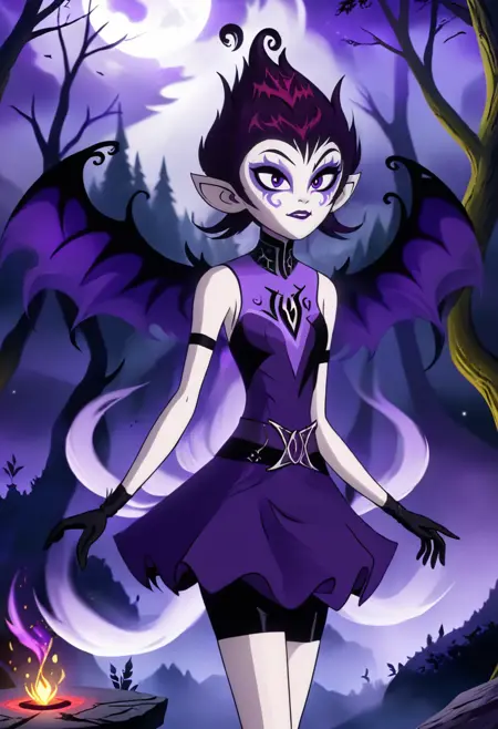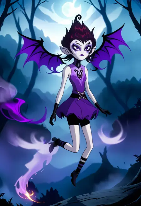 Default look: imp, pale skin, tattoo around eyes, pointy ears, red eyes, purple gloves, purple wings, dark purple hair, dark purple skirt