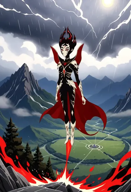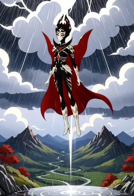 기본 외형: 붉은 눈, 붉은 동공, 얼굴 문신, 날개, 흑백 바디수트, 흰색 부츠, 하이힐, 붉은 망토