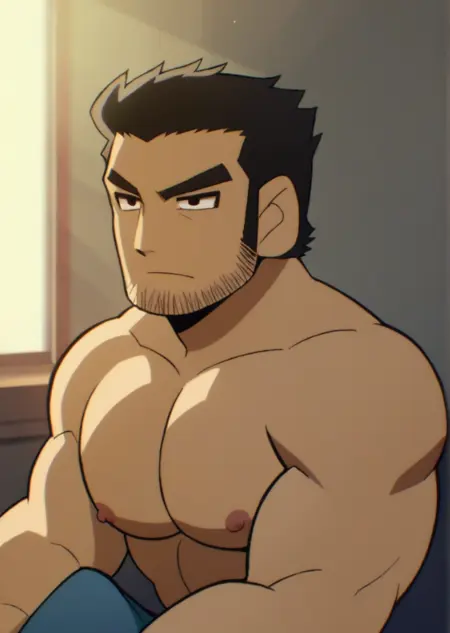 Lucas, short hair, black hair, thick eyebrows, facial hair, beard stubble, muscular, bara, large pectorals