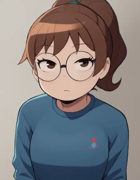 Julie, brown hair, ponytail, round eyewear