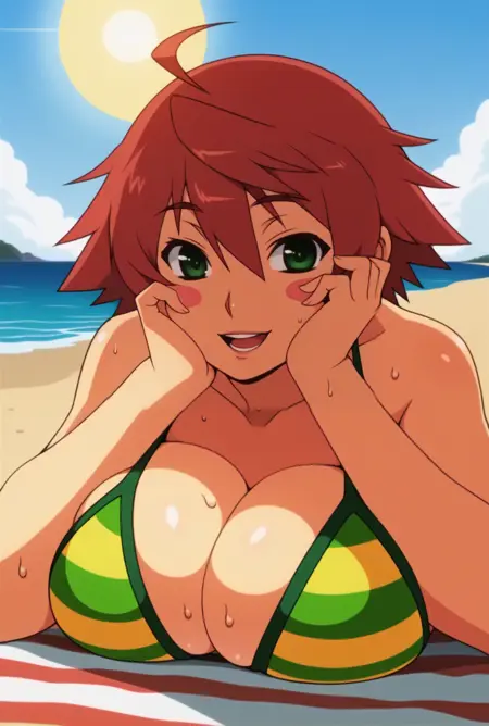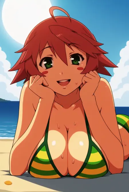 ビキニ衣装: ["yurine hayasaki, green eyes, red hair, ahoge, blush stickers, striped bikini, green bikini, navel, bare shoulders"]