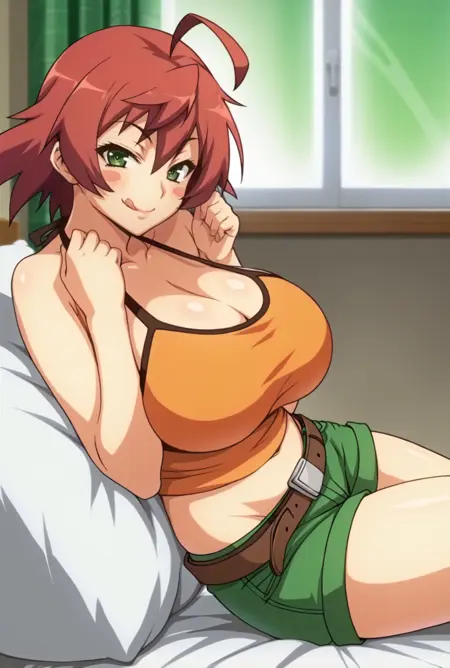 默认服装:["yurine hayasaki, green eyes, red hair, ahoge, blush stickers, orange shirt, midriff, short shorts, green shorts, belt, halterneck, cleavage"]
