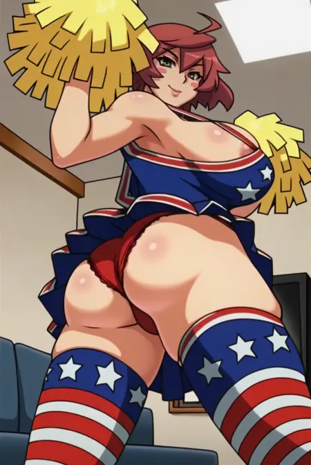 チアリーダー衣装: ["yurine hayasaki, green eyes, red hair, ahoge, blush stickers, cheerleader, pom pom \(cheerleading\), thighhighs, american flag, loose clothes"]