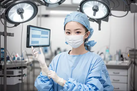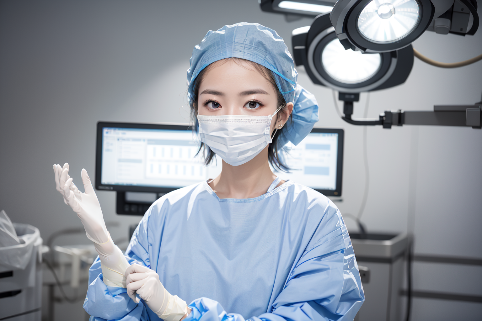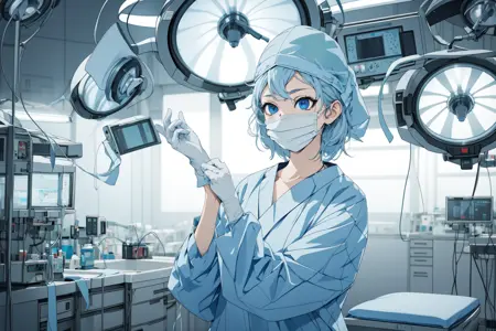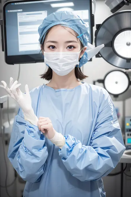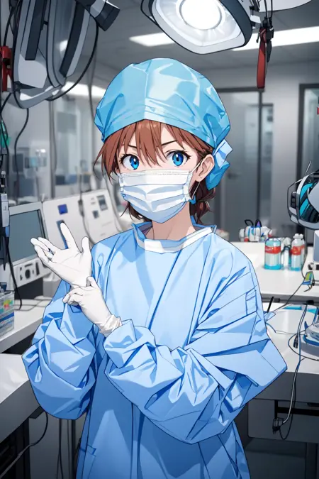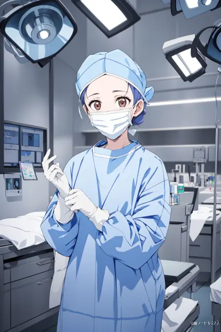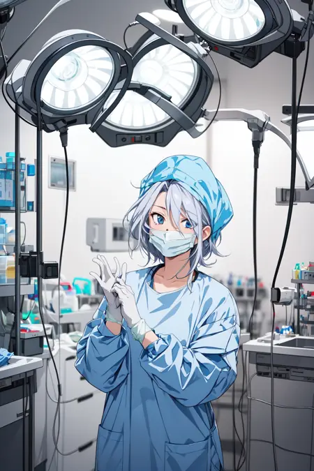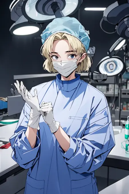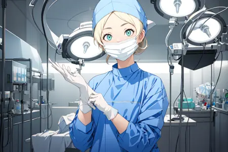 また一つの手術用衣装のバリエーションです。このモデルは「手袋を引く」ポーズを捉えています。あなたの外科医は、手術を始める前に、手袋をしっかりとフィットさせるために引き伸ばしています。