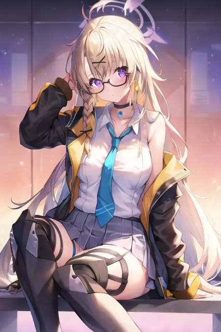 otose_kotama 를 사용하여 그녀를 소환하세요. 머리 구성은 반짝이는 빛, 백발, 긴 머리, 앞머리, 머리 장식, 옆 스타일 땋은 머리, 보라색 눈, 안경, 코일러 를 사용하고, 복장은 자켓, 오픈 컬러, 화이트 셔츠, 넥타이, 화이트 스커트, 짧은 스커트, 벨트, 부츠 를 사용하세요. 나타나길 원하지 않는 키워드는 제거하세요.