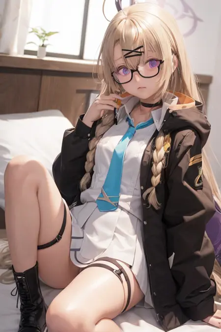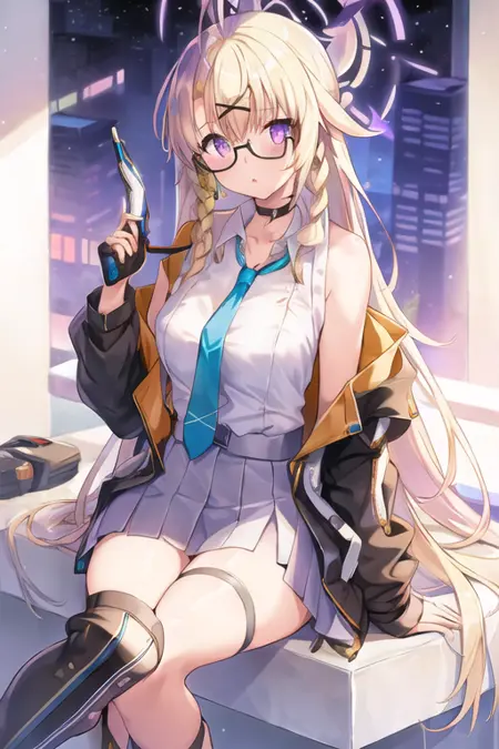 使用 otose_kotama 召唤她。使用 光环, 金色头发, 长发, 刘海, 发饰, 侧辫, 紫色眼睛, 眼镜, 领圈 构建她的头部,使用 夹克, 开衫, 白色衬衫, 领带, 白色裙子, 短裙, 腰带, 靴子 构成她的装扮,移除您不希望出现的关键词。