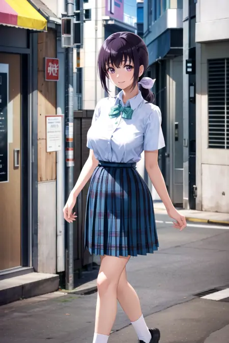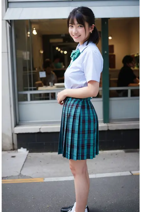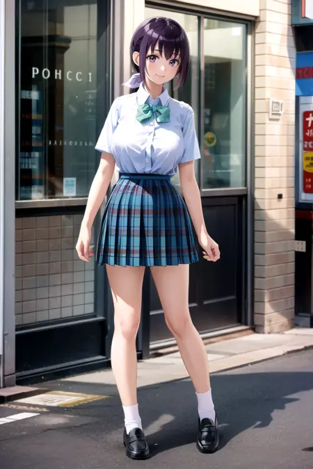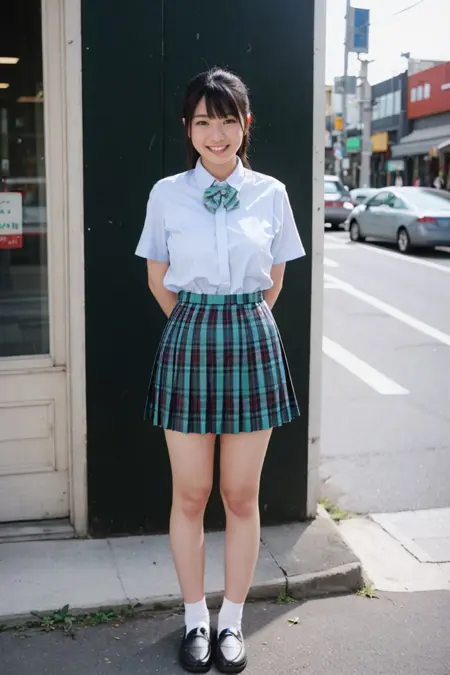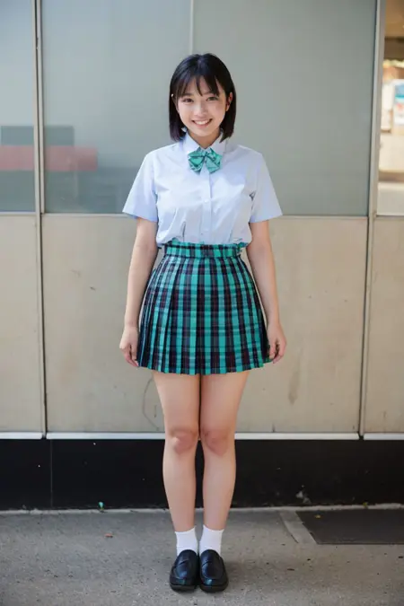 (bow, school uniform, white shirt, short sleeves, pleated skirt, collared shirt, black footwear, plaid, plaid skirt, white socks, loafers, shirt tucked in, green bowtie)