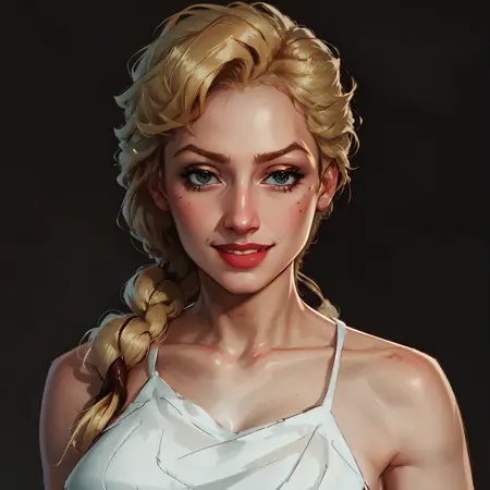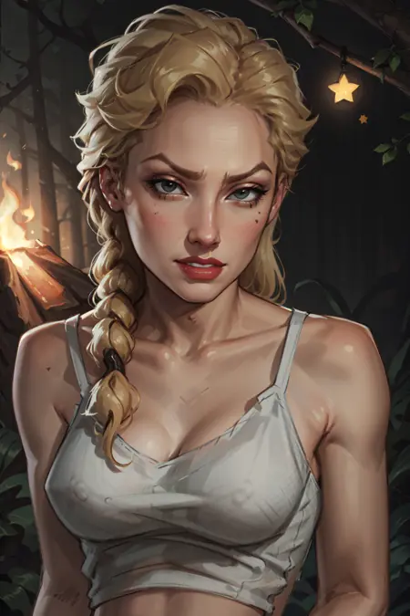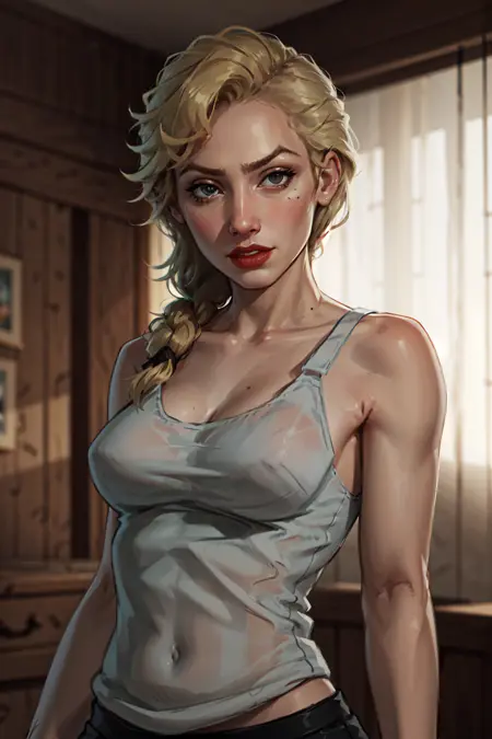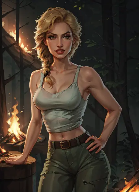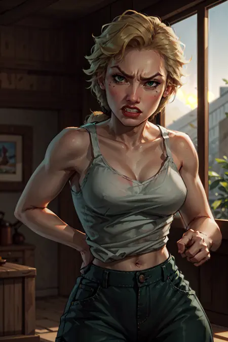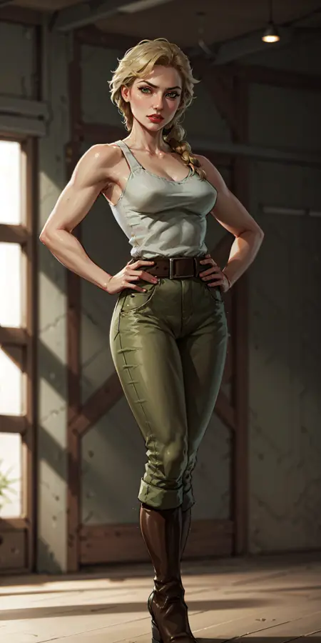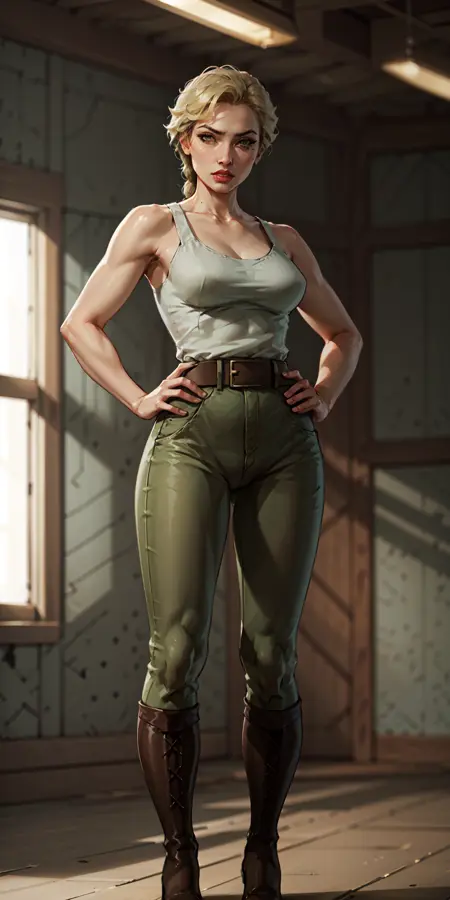 クラシックな衣装: 肩にかかっている髪, ホワイトタンクトップ, グリーンのパンツ, ベルト
