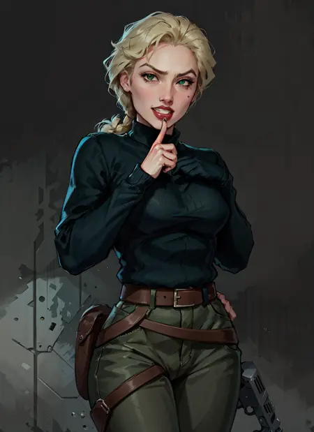 別バージョン #1: 肩にかかっている髪, ブラックタートルネック, グリーンのパンツ, ベルト