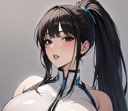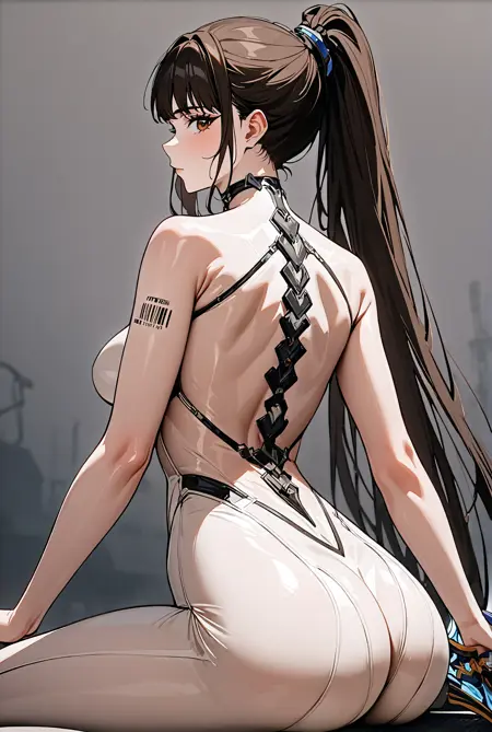 eve \(stellar blade\)主な特徴: ポニーテール、前髪をそろえたスタイル、ボディスーツ、メカニカルパーツ、バーコード、バーコードのタトゥー