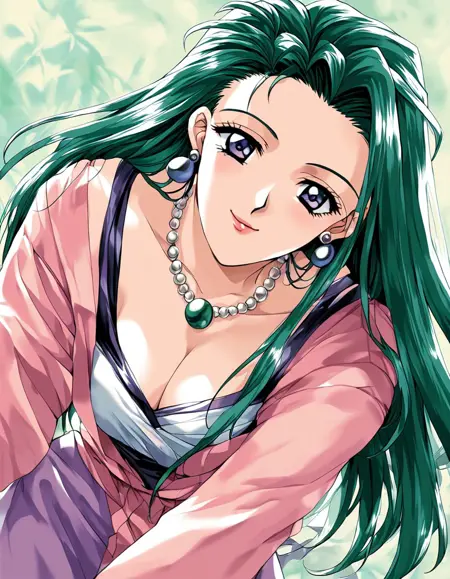 Mitsuki_Shizuka(kakyuusei), 1girl, solo, green hair, long hair, large breasts, purple earrings, purple eyes,