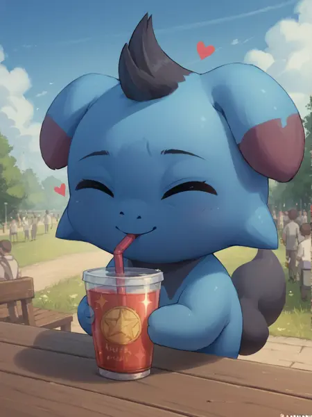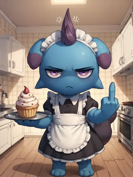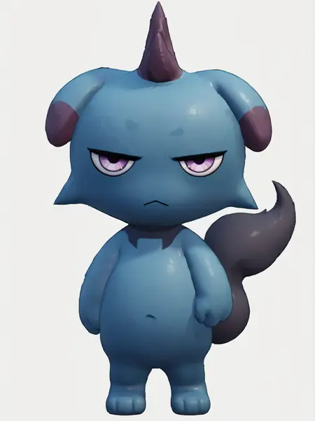 「デフォルト」の外観:青い体、紫の髪、ピンクの目、黒い尾