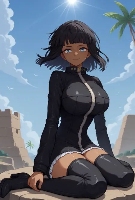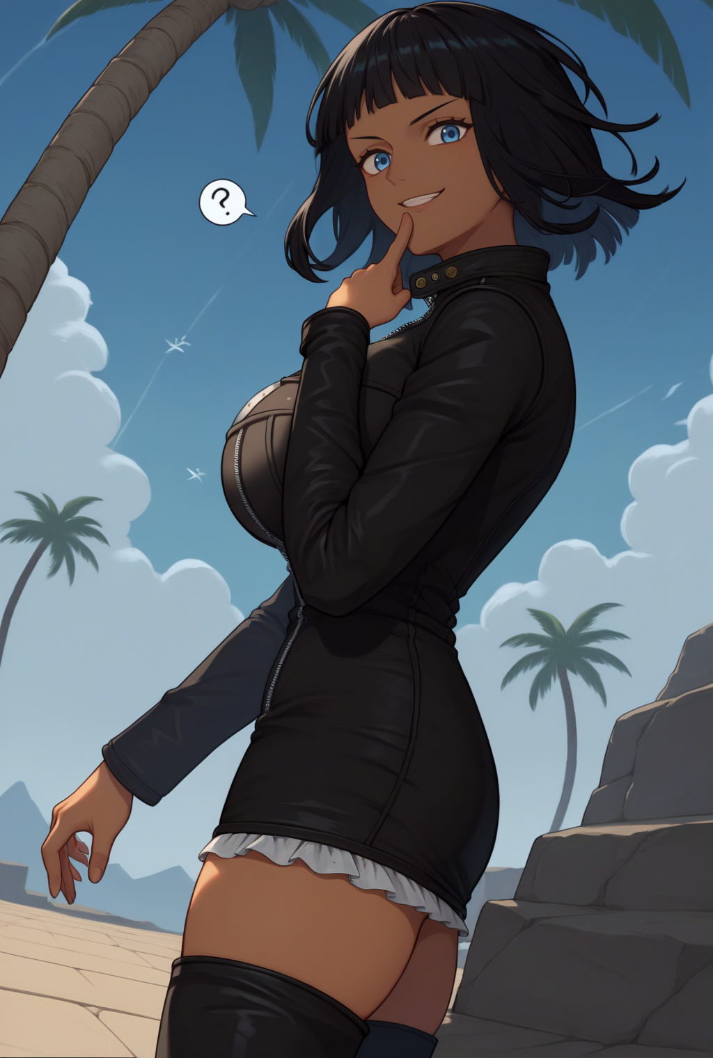 Def Outfit: ["nicorw7, blue eyes, black hair, blunt bangs, medium hair, dark-skinned female, black jacket, long sleeves, zipper, leather jacket, black thighhighs, thigh boots, high heel boots"]