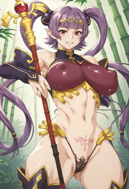 显著标签: 紫色头发,长发,双马尾,红眼睛,尖耳朵,大乳房,头环,紧身衣,遮盖乳头,肚脐,阴部纹身,内裤,可拆卸袖子,大腿靴,猴子尾巴