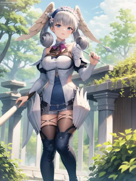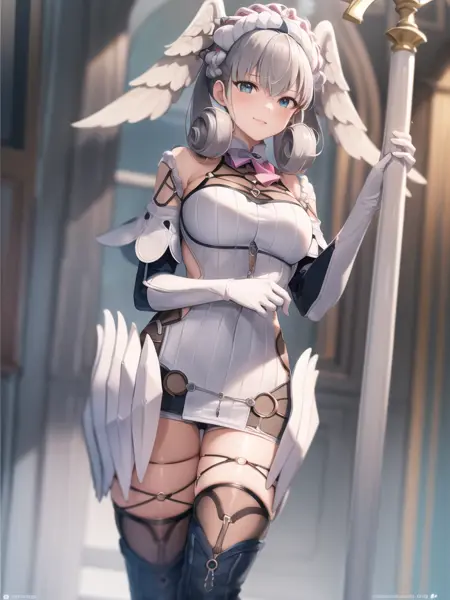 제노블레이드 크로니클스의 멜리아 아نت키카. 이 작품은 많은 시행 착오를 거쳐 만들어졌으며, 더 나은 결과를 낼 수 있도록 했습니다. 여전히 머리에 달린 날개와 페르소나 지팡이를 들고 있는 부분에서 약간 어려움을 겪고 있습니다. 다른 옷을 입히면 게임에서 사용하는 옷 스타일과 비슷하게 나타나는 경우가 있으니, 두 가지 트리거 단어를 모두 시도해 보고 더 효과적인 쪽을 이용해 보세요.
