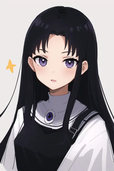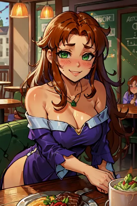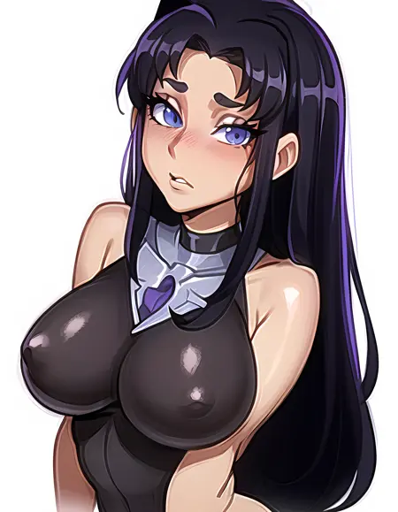 The main keyword is 'blackfire'. Additionally, other tags beginning with 'black' and 'purple' will help push it in the right direction. (i.e. 'black hair' or 'purple eyes', etc.) 'Long hair' and 'parted bangs' also helps.
