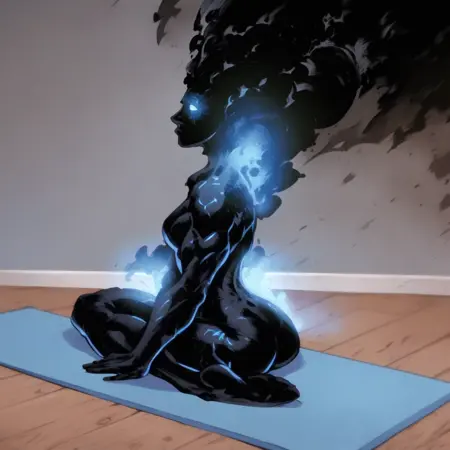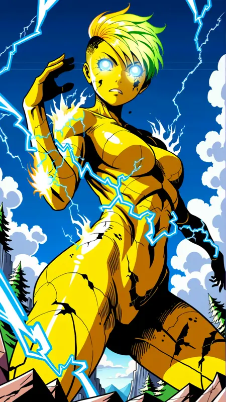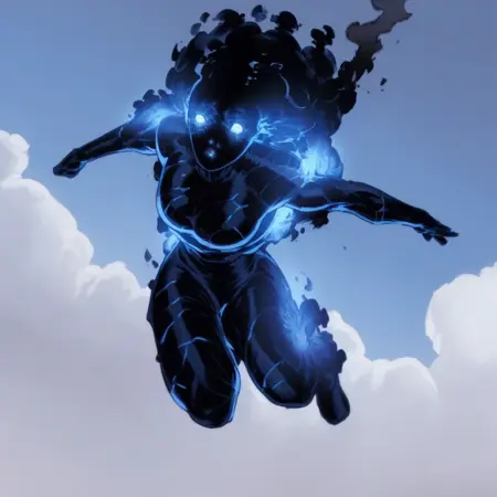 触发词:soce, woman, 黑色木炭色皮肤,黑色烟雾般头发,发光的亮蓝色实心眼睛,皮肤上的亮蓝色裂纹,