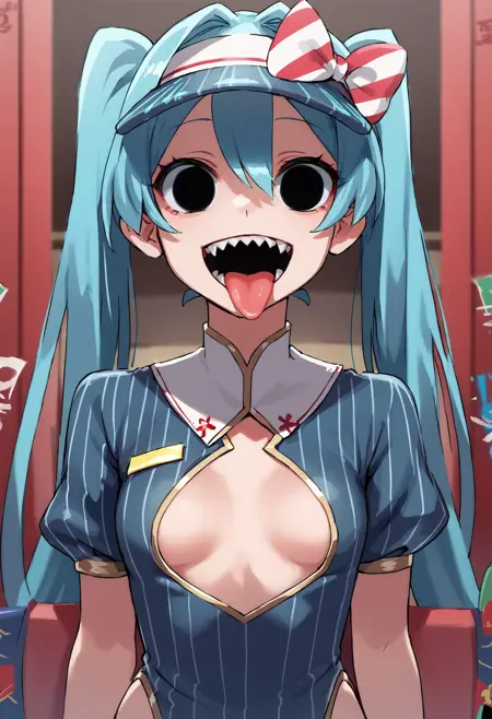 メセマライザー:mikumesmerizer、初音ミク、縦縞のドレス、ウエストエプロン、鋭い歯、ビーサン帽、開いた口、舌、空虚な目
