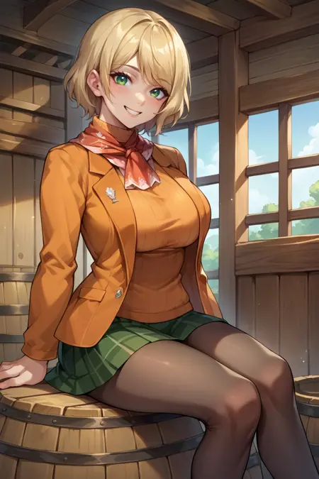 리메이크 버전 외모를 표현하려면 "녹색 눈, 빨간 넥커치ef, 주황색 재킷, 주황색 스웨터, 녹색 미니스커트, 팬티스타킹"을 추가하세요.