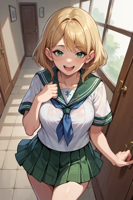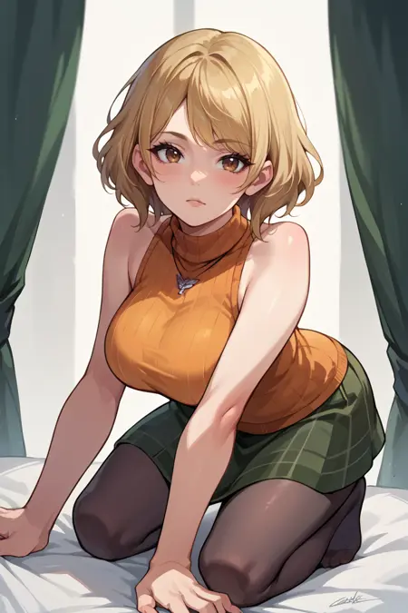 원래 외모의 변형을 표현하려면 "갈색 눈, 앞머리, 목걸이, 주황색 스웨터, 소매 없는 터틀넥, 녹색 미니스커트, 팬티스타킹"을 추가하세요.