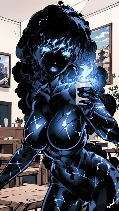 soce, woman, black charcoal skin, black smoke hair, glowing light blue solid eyes, light blue cracks in skin,