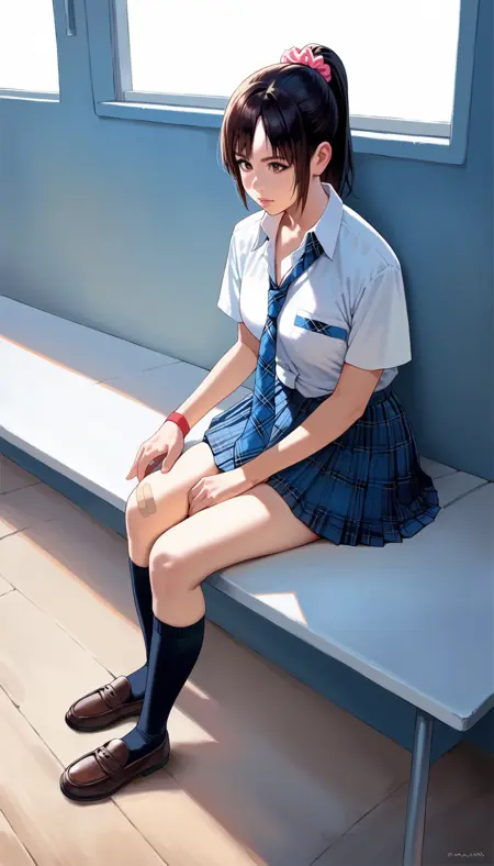 school uniform,white shirt,blue plaid skirt,blue plaid necktie,red wristband,black kneehighs,bandaid on knee,leather shoes,