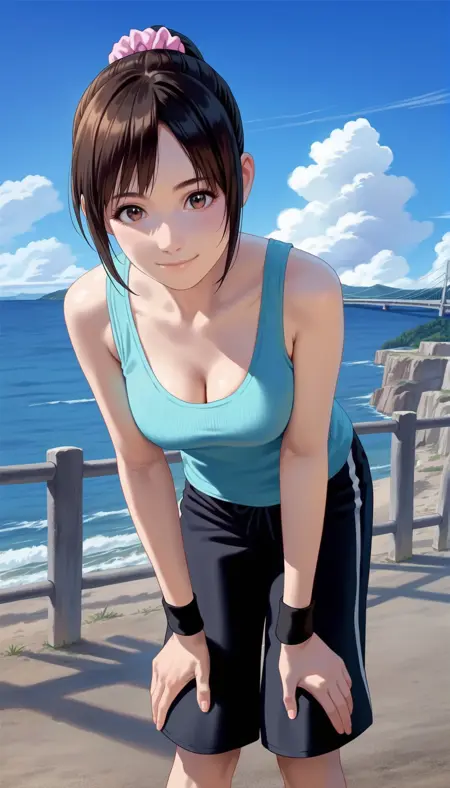 1girl,solo,black hair,bangs,ponytail,pink scrunchie,black wristband,black shorts,brown eyes,cyan tank top,