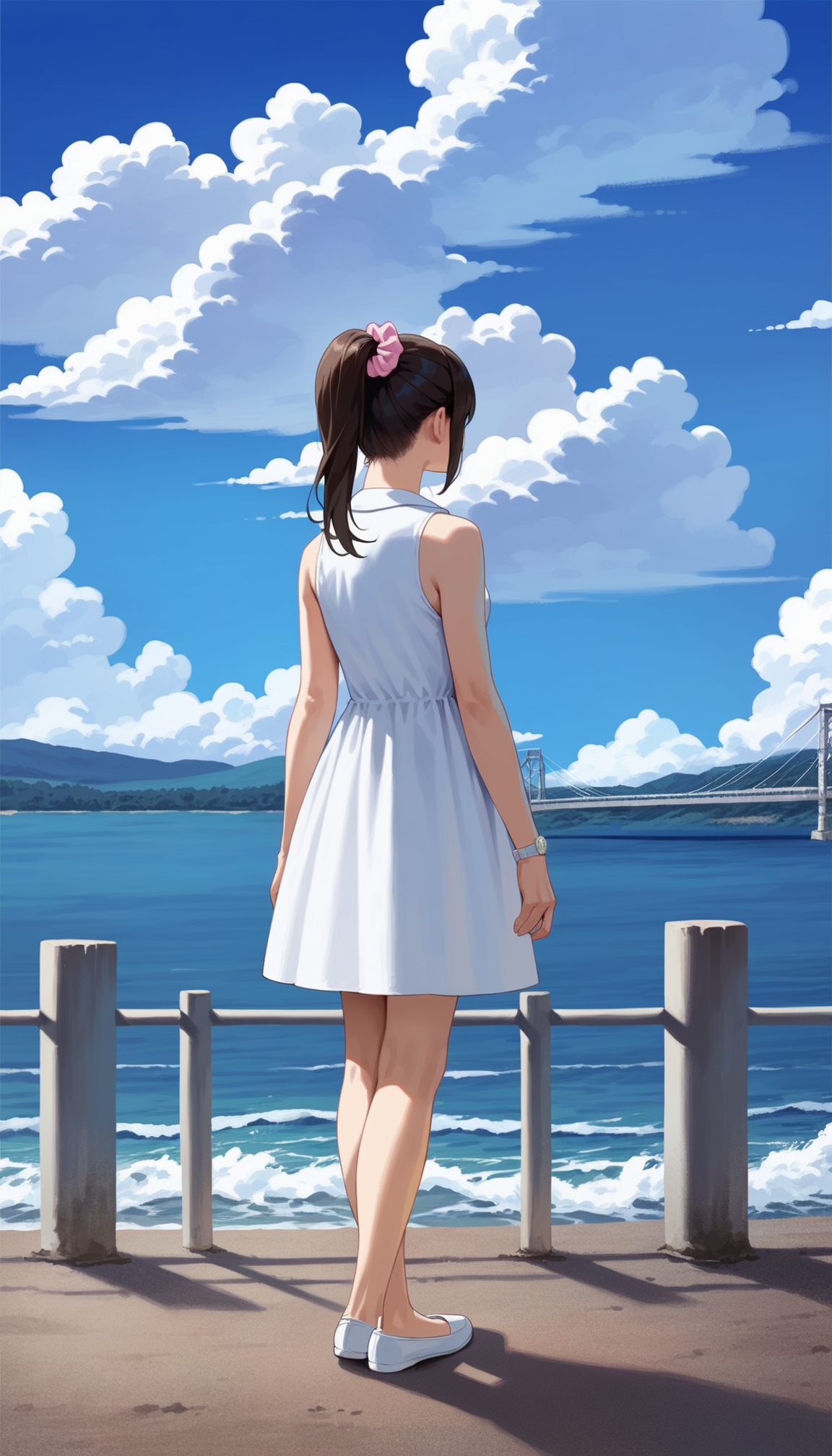 sleeveless white dress,white collar,white wristwatch,white flat shoes,