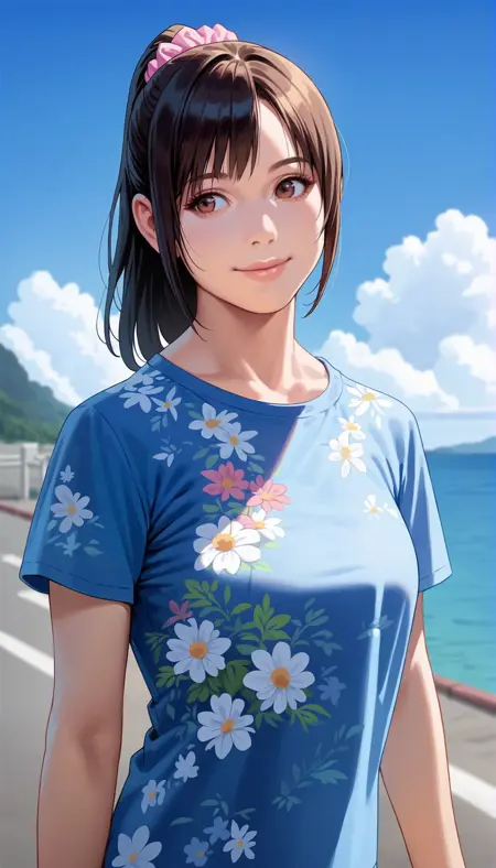 1girl,solo,black hair,ponytail,bangs,blue scrunchie,brown eyes,