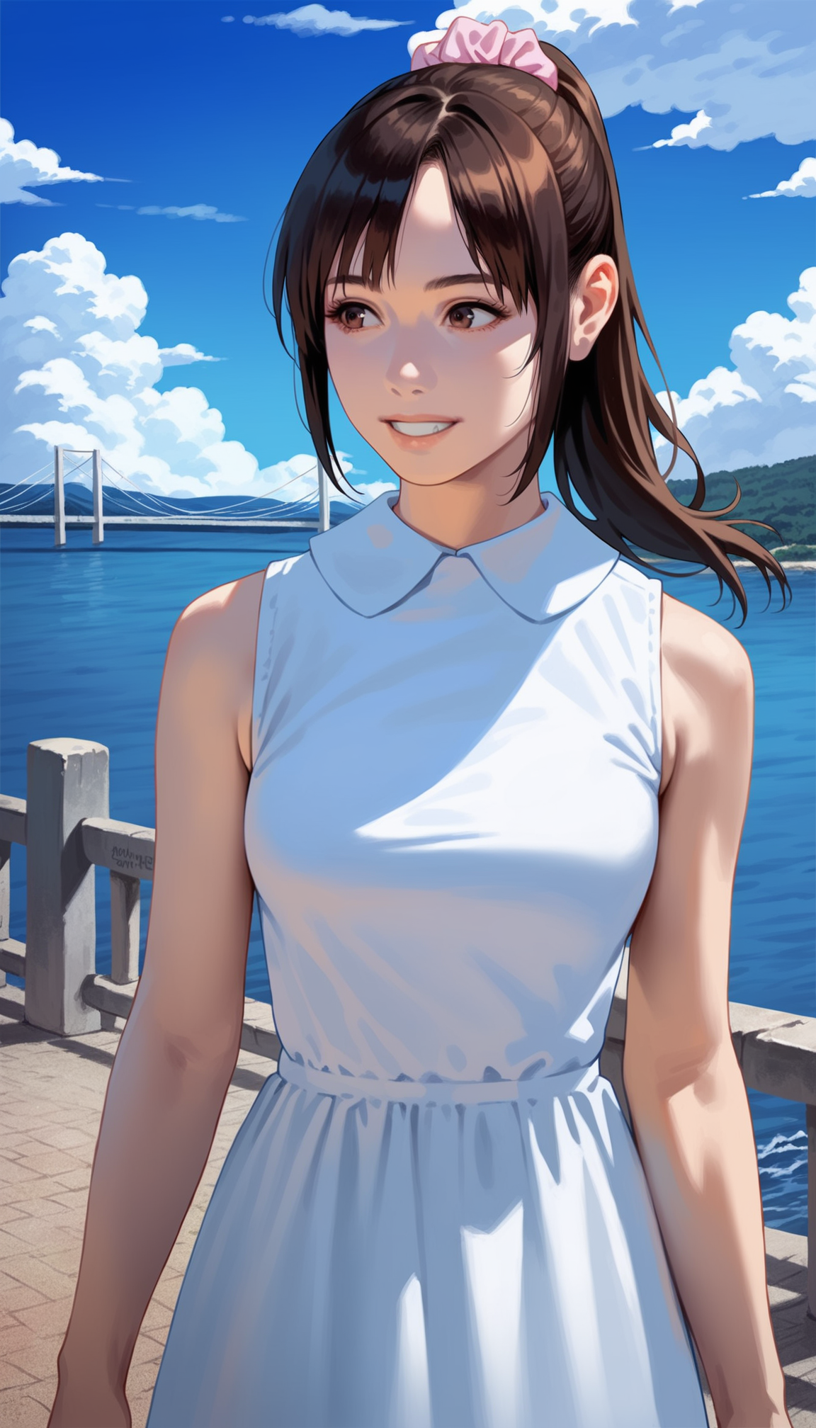 1girl,solo,black hair,ponytail,bangs,pink scrunchie,brown eyes,