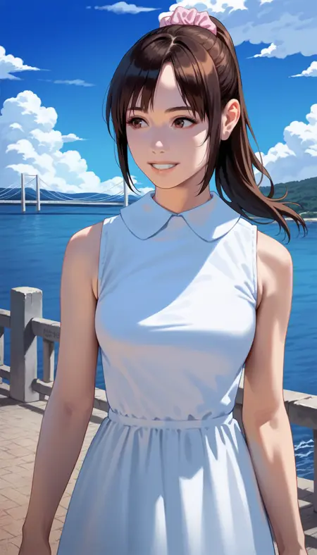 1girl, solo, black hair, bangs, ponytail, black scrunchie, brown eyes,