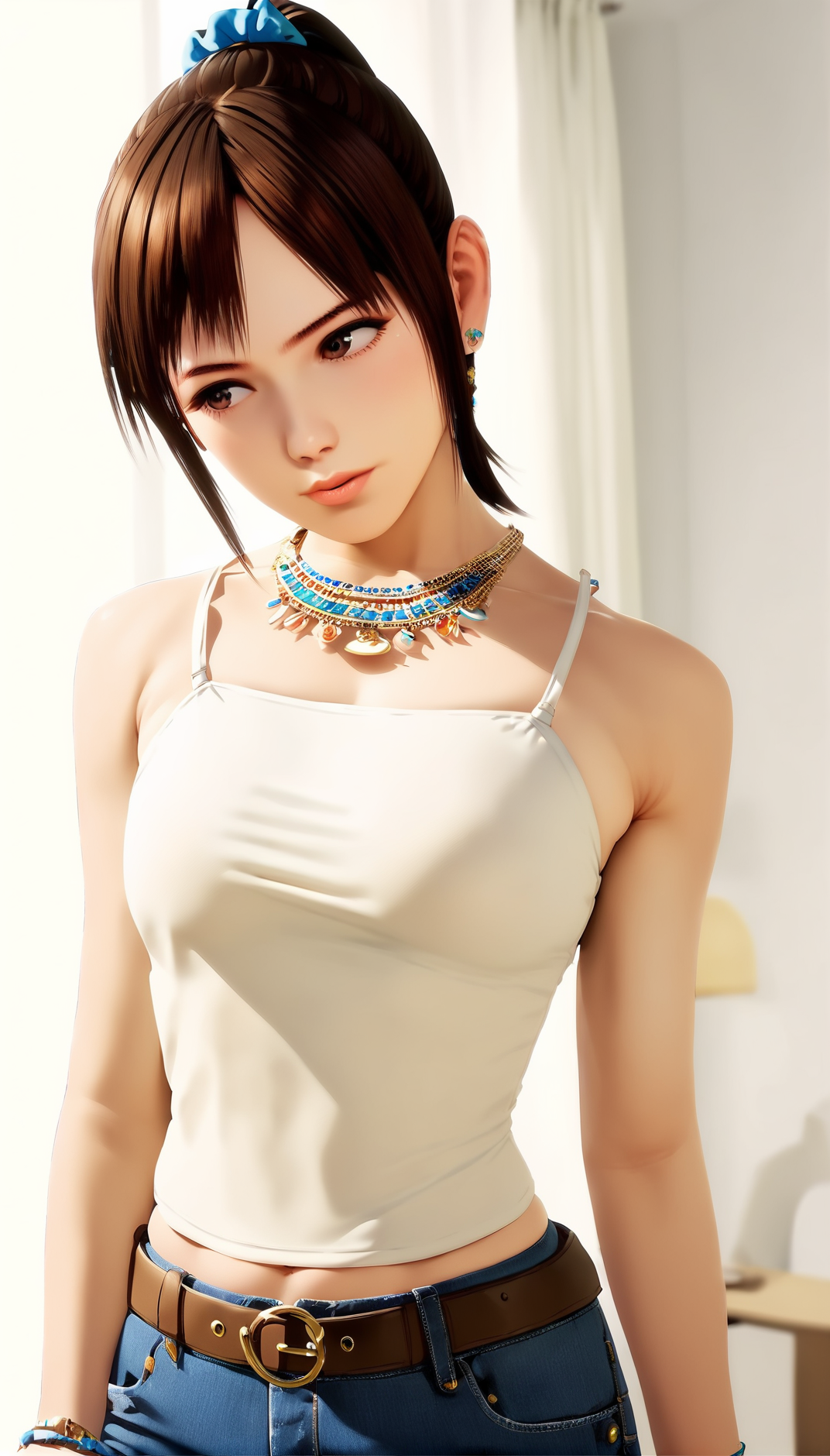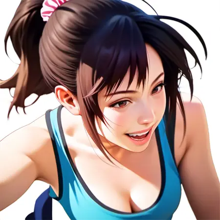 1girl,solo,black hair,bangs,ponytail,pink scrunchie,black wristband,black shorts,brown eyes,cyan tank top,