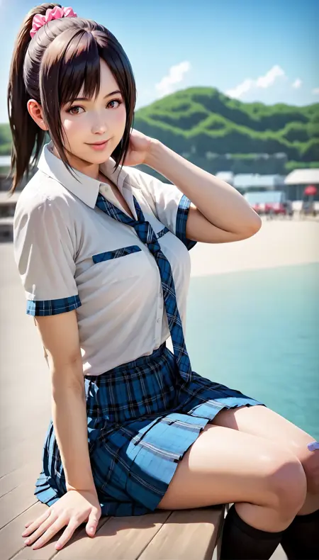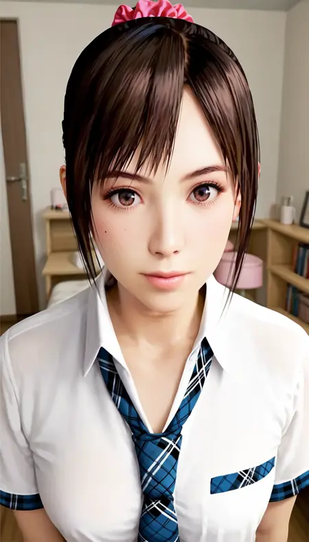 1girl,solo,black hair,ponytail,bangs,pink scrunchie,brown eyes,