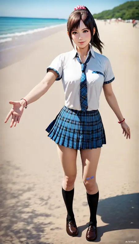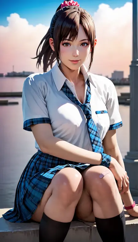 school uniform,white shirt,blue plaid skirt,blue plaid necktie,red wristband,black kneehighs,bandaid on knee,leather shoes,