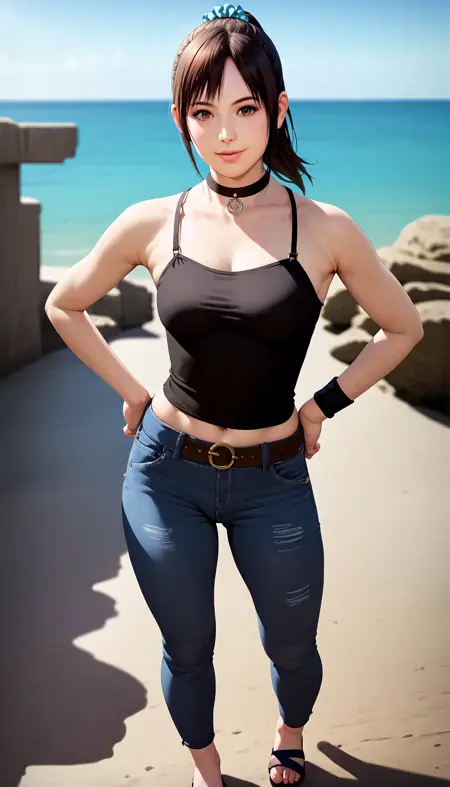 camisole, black camisole, jeans, tight clothing, belt, choker, jewelry, black wristband,