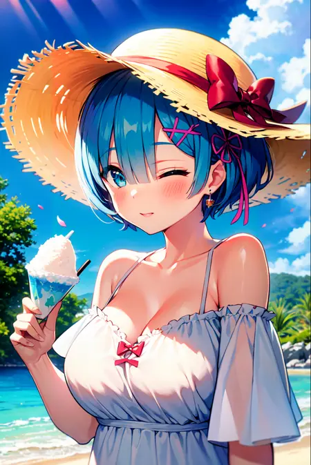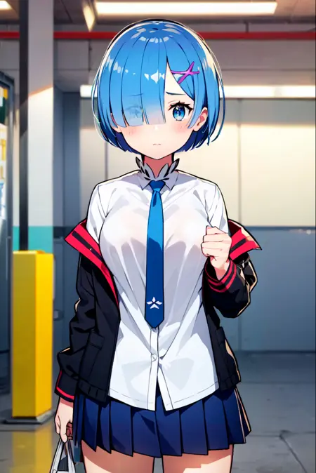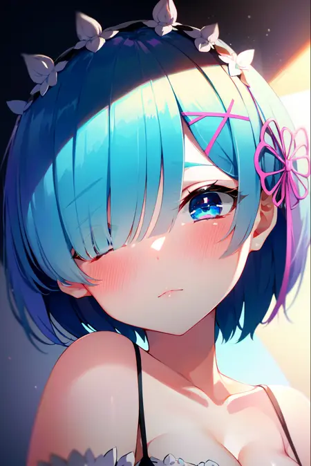 若要召唤她,请使用触发标签,并加上以下标签:1girl,blue hair,blue eyes,short hair,x hair ornament,looking at viewer,hair ornament,hair over one eye,hair ribbon,medium breasts