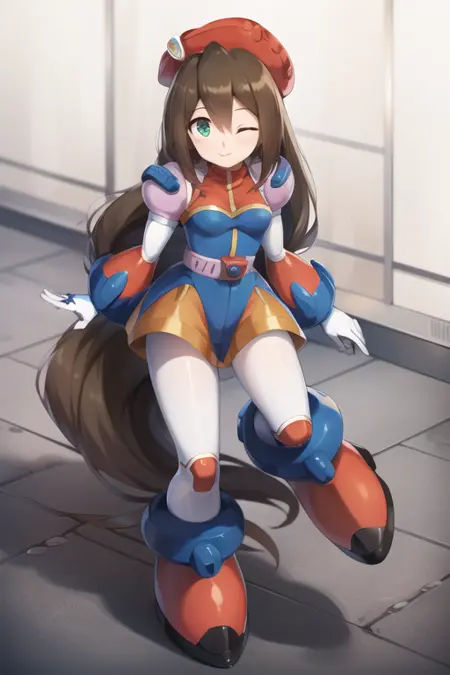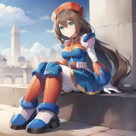 long hair, brown hair, hat, green eyes, white gloves, beret